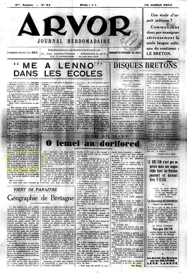 Retour à l'étude Roparz Hémon, Arvor, l'antisémitisme et le PNB, en janvier 1944