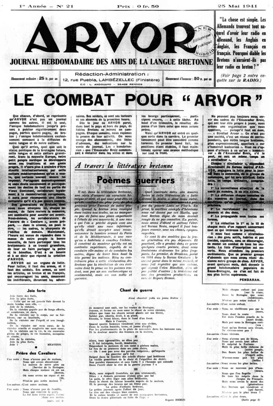 Arvor n° 21, 25 mai 1941, Une