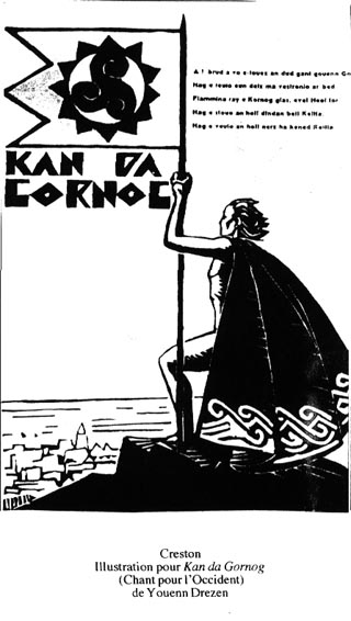 Porteur des valeurs de l’extrême-droite, Breiz Atao fut dès le début l’expression d’un racisme qui faisait de la défense de la Bretagne opprimée par la France la défense d’une culture ethniquement pure, car celte, contre la déchéance de la France métissée. Le volume le plus représentatif de cette idéologie est l’Histoire de notre Bretagne que Jeanne Coroller-du Guerny publie sous le pseudonyme de Danio en 1922 avec les illustrations de Jeanne Malivel. L’éloge du duc Jean 1er qui « s’occupa activement du bien de son peuple » en chassant les juifs et l’illustration sur le Traité d’Union représentant la France volant la bourse de la Bretagne firent scandale en leur temps (1). ________________________ 1 / Le volume vient d'être réédité par des éditions clairement marquées à l'extrême-droite, avec préface d'Henry Caouissin, et est commenté très élogieusement par Denise Delouche, l'une des responsables de l'exposition qui voit dans l'illustration du Traité d'Union une des illustrations les plus fortes du livre et les plus chargées de sens politique (Ar Men n°83, p.38). Il m'aurait plus de travailler pour quelque chose de moins haineux, regrettait pourtant Jeanne Malivel, qui devait interdire la reproduction de ses illustrations. ________________________ A la même époque, Jeanne Malivel rencontre René-Yves Creston (1898-1964), sa femme Suzanne (1899-1979) et Georges Robin (1904-1928). En 1923, ils décident de créer une confrérie d’artistes en lui donnant le nom de Seiz Breur (« Sept Frères »). Les réalisations de ces artistes, associés à des artisans comme Christian Le Part (qui sera, lui aussi, abattu par la Résistance) relèvent du désir de créer un art décoratif national breton. Leur vision, qui est l’expression de Breiz Atao dans le domaine de l’art, trouve naturellement à s’exprimer comme complément artistique au supplément littéraire de Breiz Atao, la revue Gwalarn, dirigée par Louis Némo, dit Roparz Hemon (1900-1978), pionnier de la collaboration du mouvement breton avec les nazis (2). Ce supplément artistique dirigé par Creston s’intitule Kornog, autrement dit Occident, ce qui s’inscrit clairement dans l’idéologie de Breiz atao. ________________________ 2 / On sait que Diwan a dû débaptiser son collège Roparz Hemon à la demande du Conseil Général du Finistère, ce linguiste faisant notamment partie des agents de la gestapo en Bretagne ________________________ Pour adhérer aux Seiz Breur, il faut être de sang breton (article 1 du Règlement de l’Unvaniez Seiz Breur : « Être né en Bretagne ou à l’étranger de parents bretons». Adhèrent alors des collaborateurs de Breiz Atao comme Youenn Drezen (1889-1972) dont Creston illustre le Kan da Gornog (Chant pour l’Occident) et François Elies, dit Abeozen (1896-1963) qui prendra avec Roparz Hemon la direction de la radio bretonne sous contrôle des services de propagande allemande. L’Occupation est la période la plus faste qu’aient connue les Seiz Breur. Encourageant en sous-main les visées autonomistes, les nazis permettent à une presse bretonne florissante de voir le jour. Si L’Heure bretonne est ouvertement pro-nazie, Arvor, le journal de Roparz Hemon, quoique partisan de « l’Europe nouvelle », se veut une vitrine culturelle, tandis que La Bretagne de Fouéré affiche un pétainisme résolu. En fait, la collusion entre les responsables de ces journaux est telle que certaines polémiques sont organisées de concert. Creston collabore à L’Heure bretonne comme à La Bretagne où, avec Xavier Haas et Langlais, il assure l’illustration de cette presse collaborationniste. Le groupe prolifère, s’accroissant de militants du Parti nationaliste breton comme Henri Caouissin, secrétaire de l’abbé Perrot qui allait être exécuté par la Résistance, Yann Goulet (1914-1999) chef des organisations de jeunesse du PNB. cliquez sur l'image |