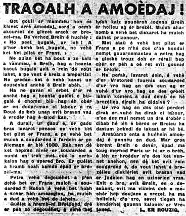 « Mar groa kerent Breih o dever, epad tria toug merhed Pariz ur hi ar o breh, e leh er hroedur n’o des ket vennet anehon, nen de ket evit rein soudarded e, de vout lahet e brezelieu diskleriet evit brasan vad er Judeion hag en uzinerion vras »